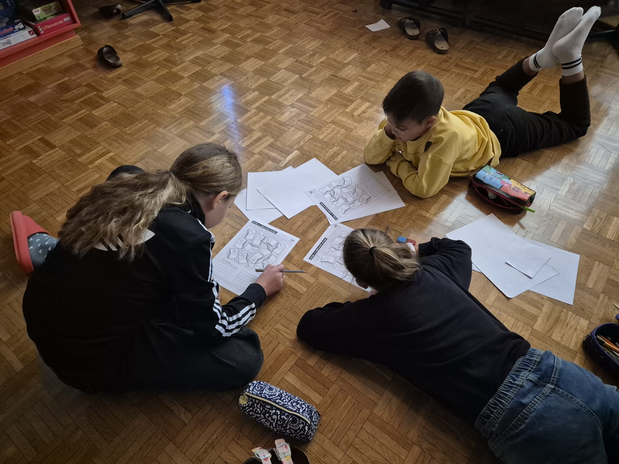 In kleinen Gruppen mussten vier Rätsel gelöst werden, welche alle zu einer Lösungszahl führten. Alle Rätsel behandelten aktuelle und bekannte Deutsch-Themen. In einem Textverständnis mussten verkleidete Kinder ihren Kostümen zugeordnet werden. In der Bibliothek mussten die wild herumfliegenden Bücher wieder nach dem Alphabet geordnet werden. Bei gruseligen Sätzen fehlten die Satzschlusszeichen und in einer kurzen Gruselgeschichte waren Fehler in der Gross- und Kleinschreibung versteckt. Mit dem vierstelligen Code konnte anschliessend eine Schatztruhe geöffnet werden, welche den Gegenzauber und eine kleine Süssigkeit für alle erfolgreichen Rätsel-Gruppen enthielt.