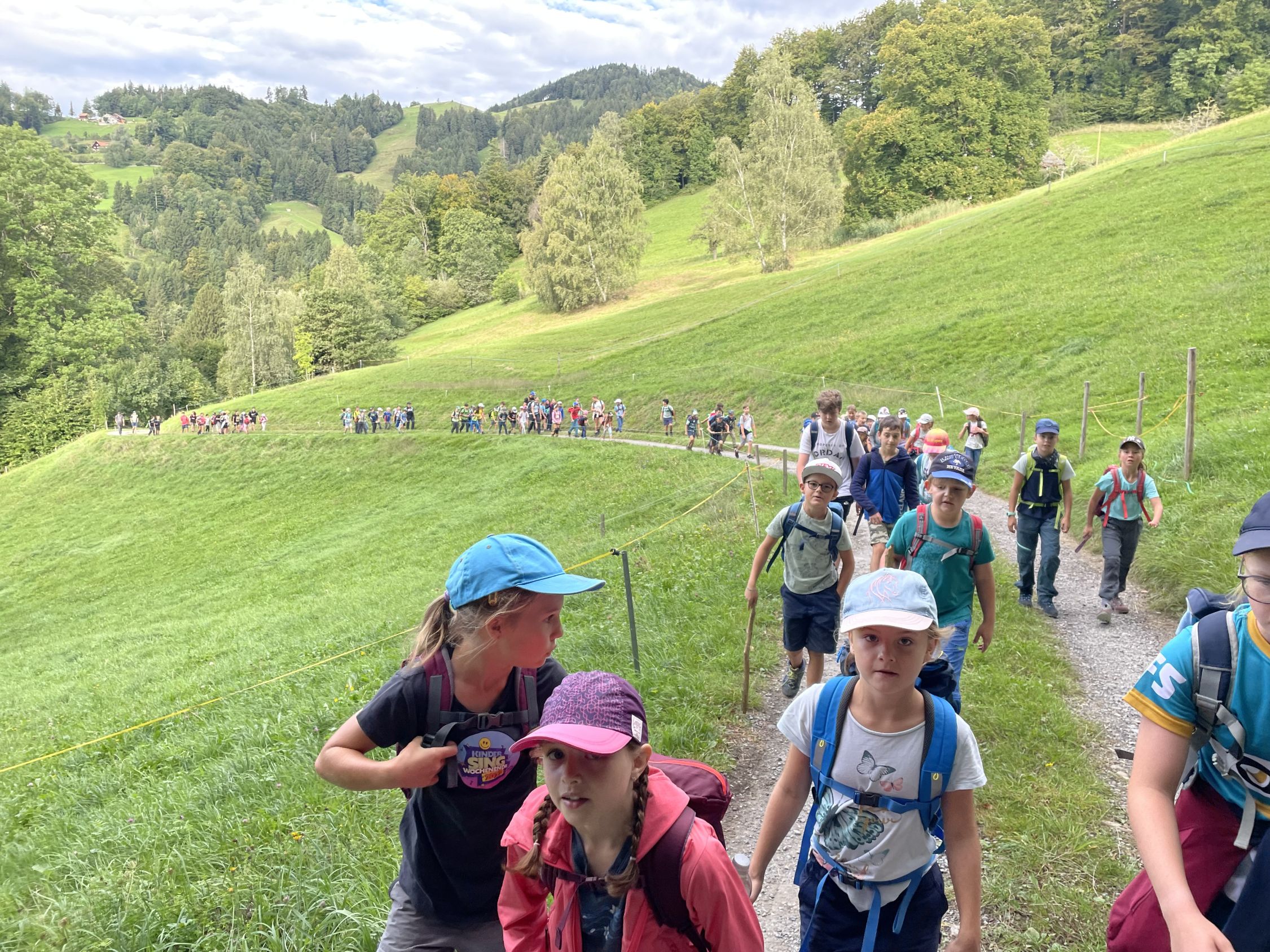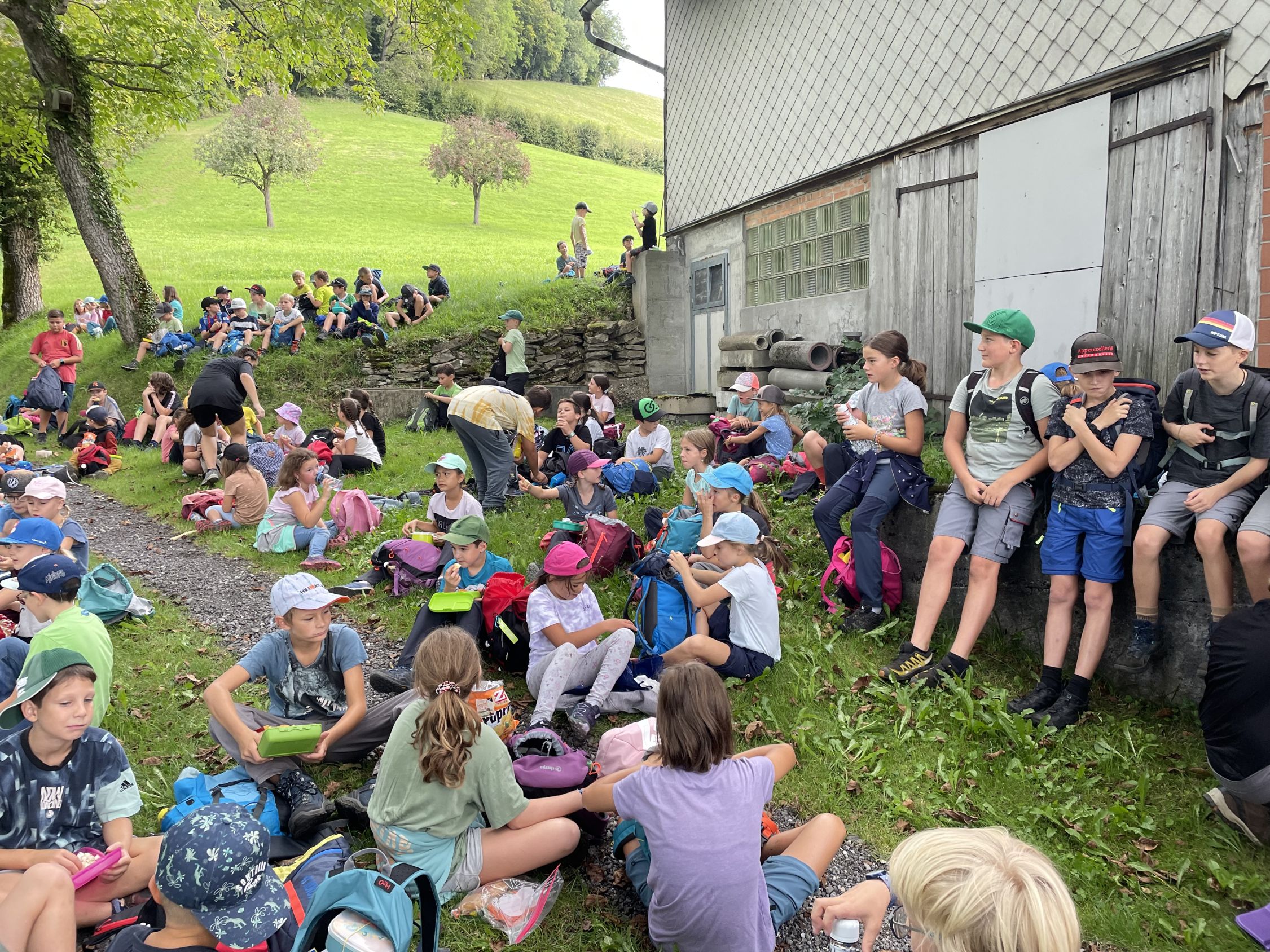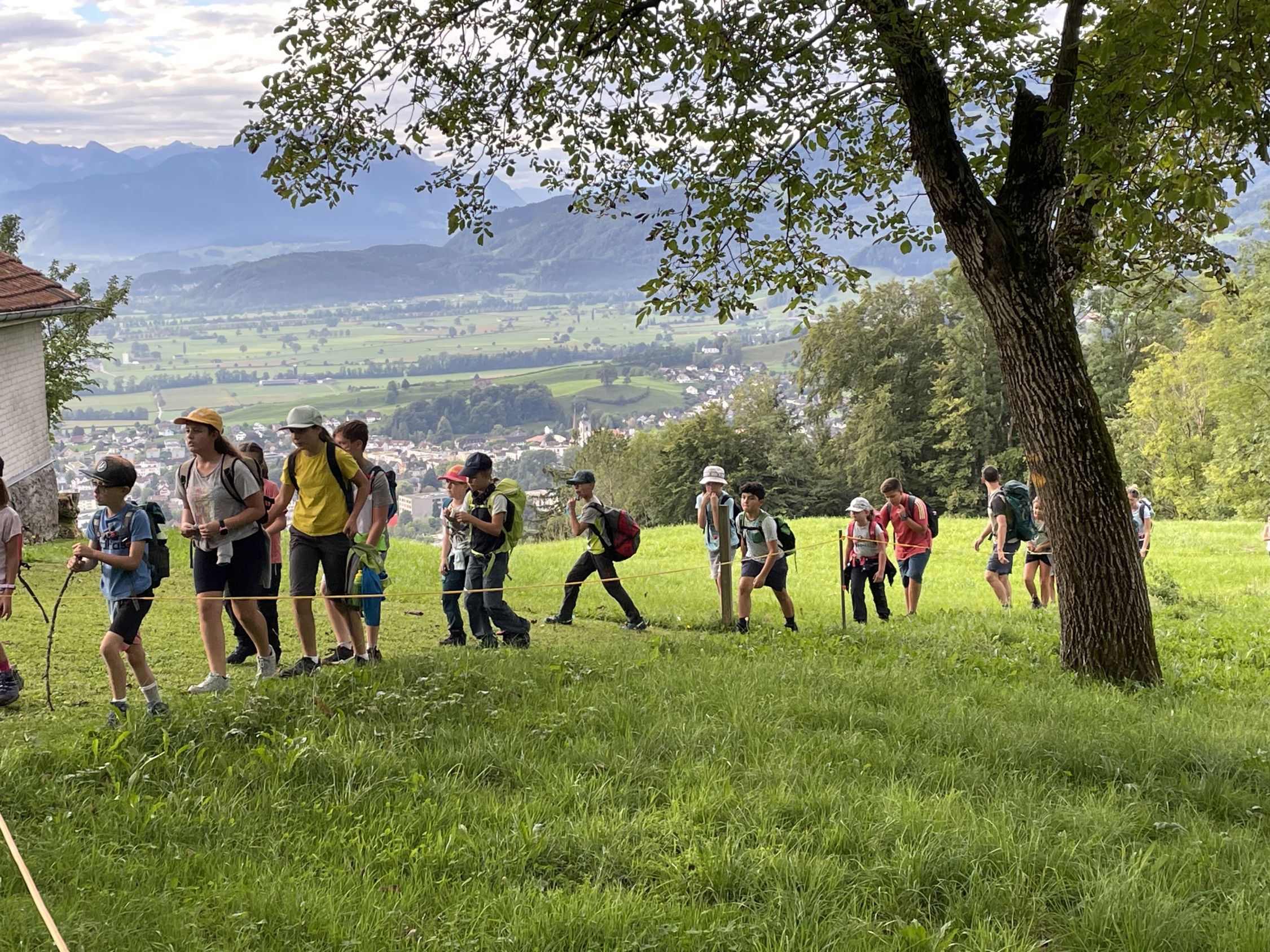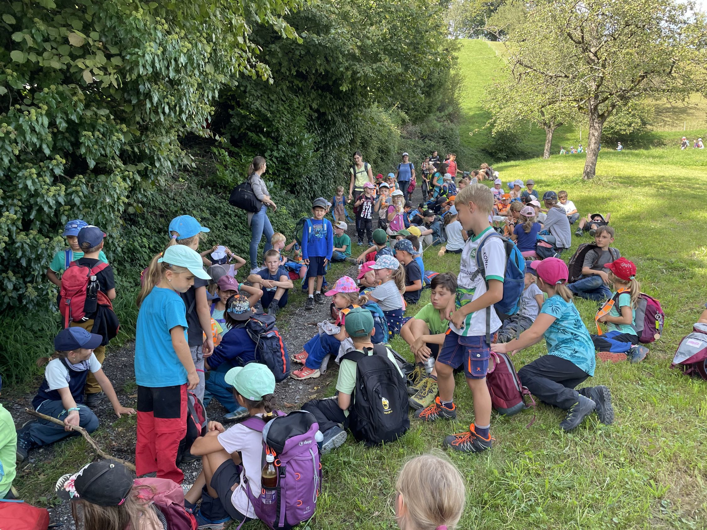 Die Wettervorhersage war gut und unsere traditionelle Herbstwanderung konnte am Donnerstag, 21. September 2023 durchgeführt werden. Bei perfektem Wanderwetter trafen sich die Schüler*innen der 2. - 6. Klasse morgens beim Schulhaus Kirchfeld. Von dort aus ging es in einem überraschend schnellen Tempo über Waldpark-Burgfeld-Steigershäuser-Boden-Morgarot bis zur Marper Hütte. Bereits um 10.30 Uhr trafen die Kinder bei den vorbereiteten Feuerstellen ein.