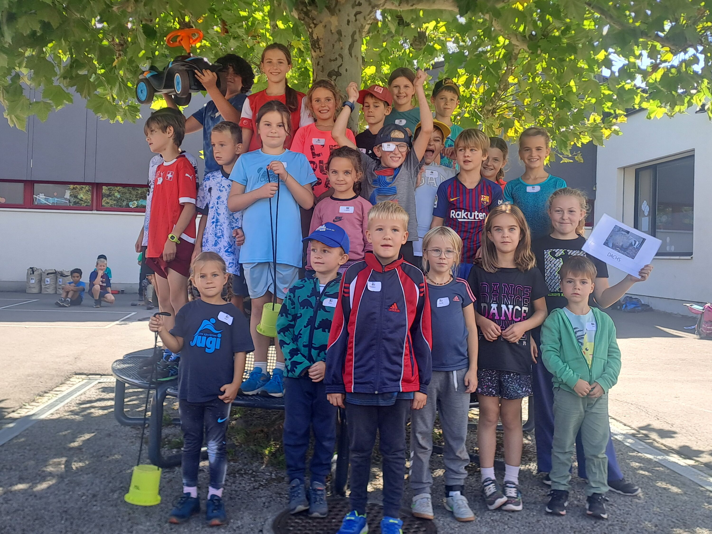 Im Roosen war einiges los! Die Schmetterlinge des Kindergartens und alle Schulkinder trafen sich auf dem Areal, um einen gemeinsamen Sportmorgen zu verbringen. Gestartet wurde mit einem bereits bekannten Tanz auf der Wiese. Anschliessend spielten die Kinder in Gruppen unterschiedliche Spiele, wobei sie sich auch aneinander messen konnten. Die Posten forderten Schnelligkeit, Zusammenarbeit und Mitarbeit jedes einzelnen Team-Mitliedes sowie viel Geschick. Die Kinder versuchten sich am Fröbelturm, an einem Hindernislauf oder warfen mit Gummistiefeln um die Wette. Ebenfalls machten sie eine Wasserstafette, bauten Kappla- und Giraffen-Türme. Besonders viel Geschick und das Quäntchen Glück benötigten sie bei der Bottle-Flip-Stafette.