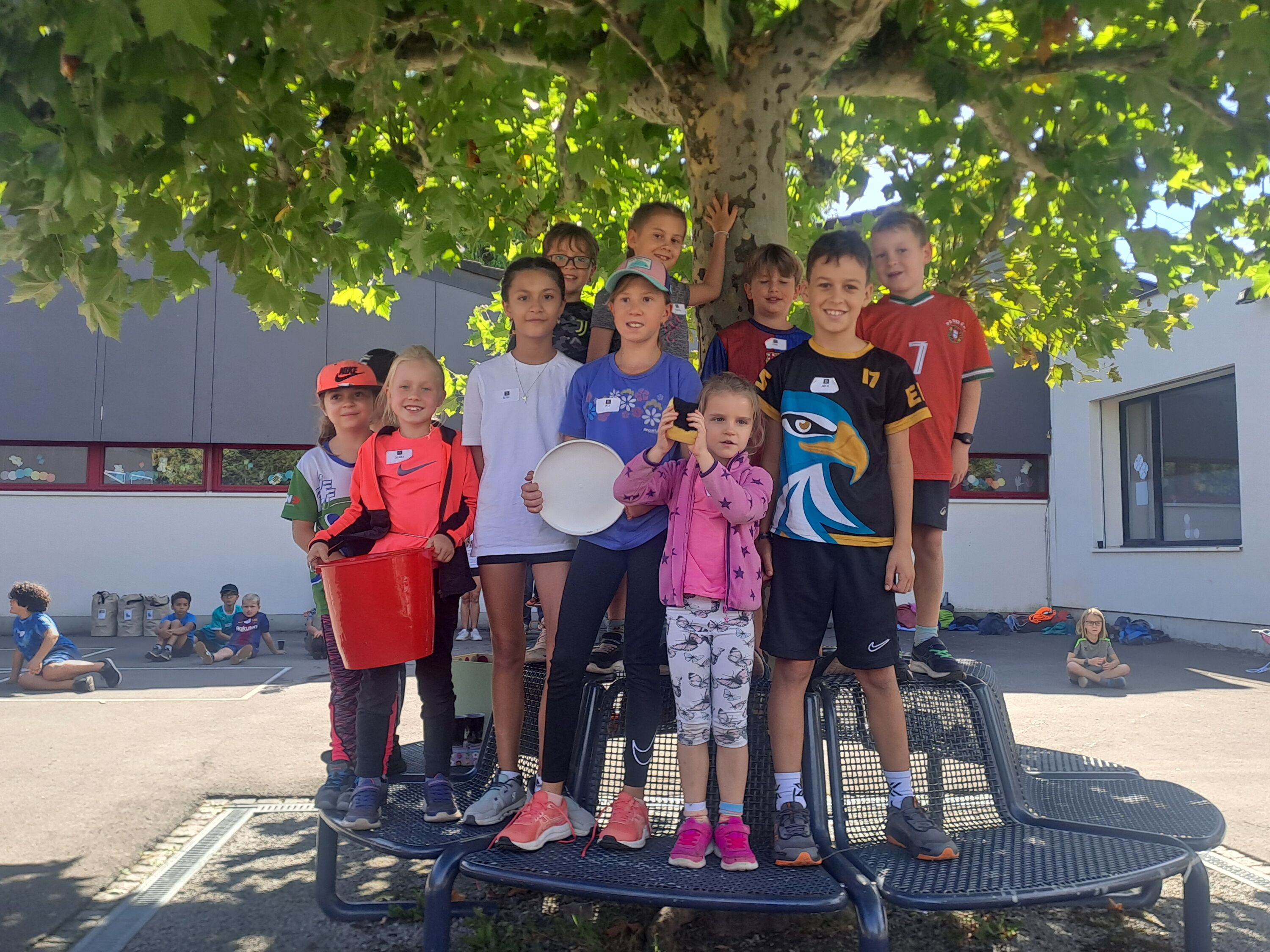 Im Roosen war einiges los! Die Schmetterlinge des Kindergartens und alle Schulkinder trafen sich auf dem Areal, um einen gemeinsamen Sportmorgen zu verbringen. Gestartet wurde mit einem bereits bekannten Tanz auf der Wiese. Anschliessend spielten die Kinder in Gruppen unterschiedliche Spiele, wobei sie sich auch aneinander messen konnten. Die Posten forderten Schnelligkeit, Zusammenarbeit und Mitarbeit jedes einzelnen Team-Mitliedes sowie viel Geschick. Die Kinder versuchten sich am Fröbelturm, an einem Hindernislauf oder warfen mit Gummistiefeln um die Wette. Ebenfalls machten sie eine Wasserstafette, bauten Kappla- und Giraffen-Türme. Besonders viel Geschick und das Quäntchen Glück benötigten sie bei der Bottle-Flip-Stafette.