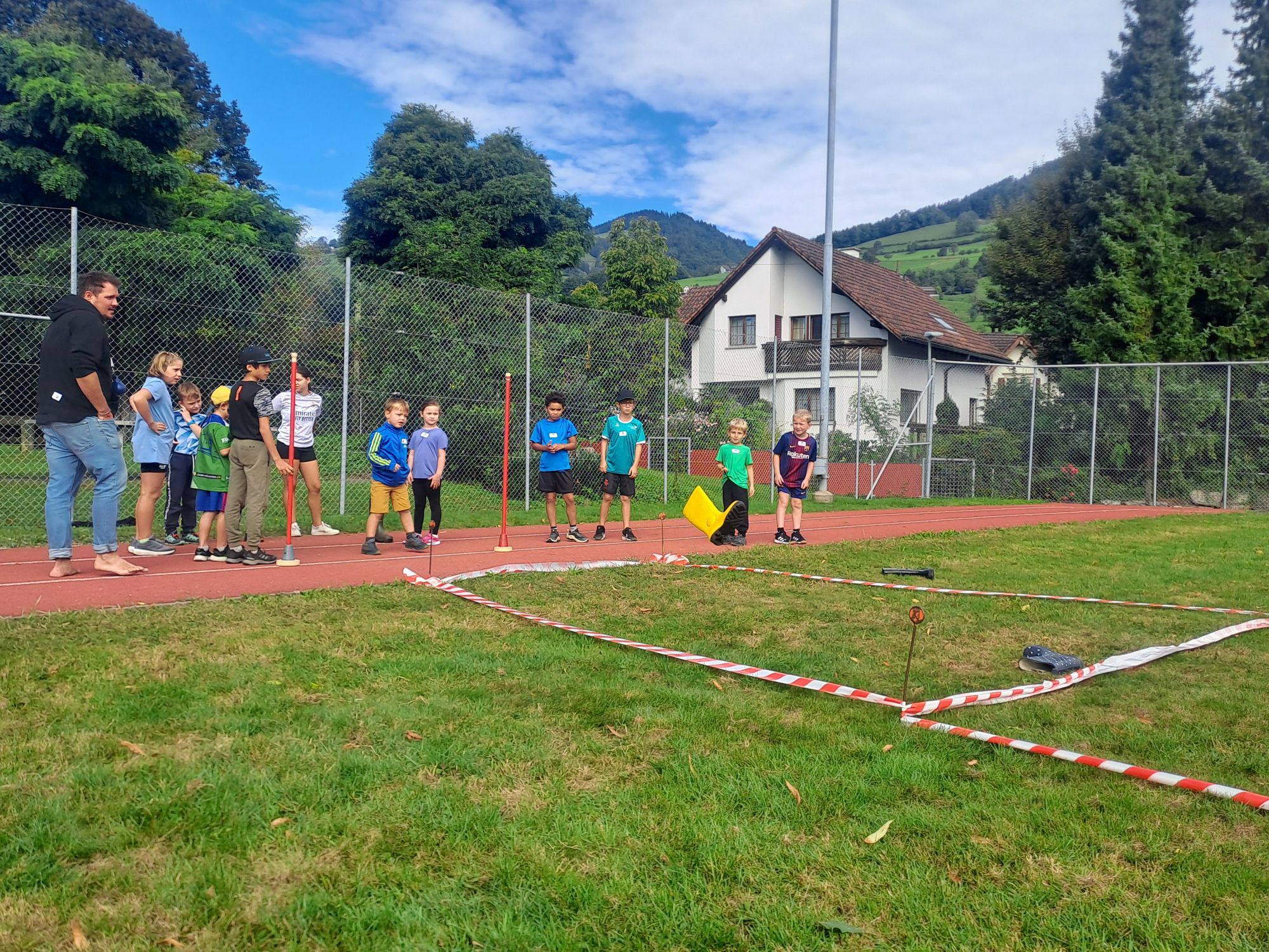 Im Roosen war einiges los! Die Schmetterlinge des Kindergartens und alle Schulkinder trafen sich auf dem Areal, um einen gemeinsamen Sportmorgen zu verbringen. Gestartet wurde mit einem bereits bekannten Tanz auf der Wiese. Anschliessend spielten die Kinder in Gruppen unterschiedliche Spiele, wobei sie sich auch aneinander messen konnten. Die Posten forderten Schnelligkeit, Zusammenarbeit und Mitarbeit jedes einzelnen Team-Mitliedes sowie viel Geschick. Die Kinder versuchten sich am Fröbelturm, an einem Hindernislauf oder warfen mit Gummistiefeln um die Wette. Ebenfalls machten sie eine Wasserstafette, bauten Kappla- und Giraffen-Türme. Besonders viel Geschick und das Quäntchen Glück benötigten sie bei der Bottle-Flip-Stafette.