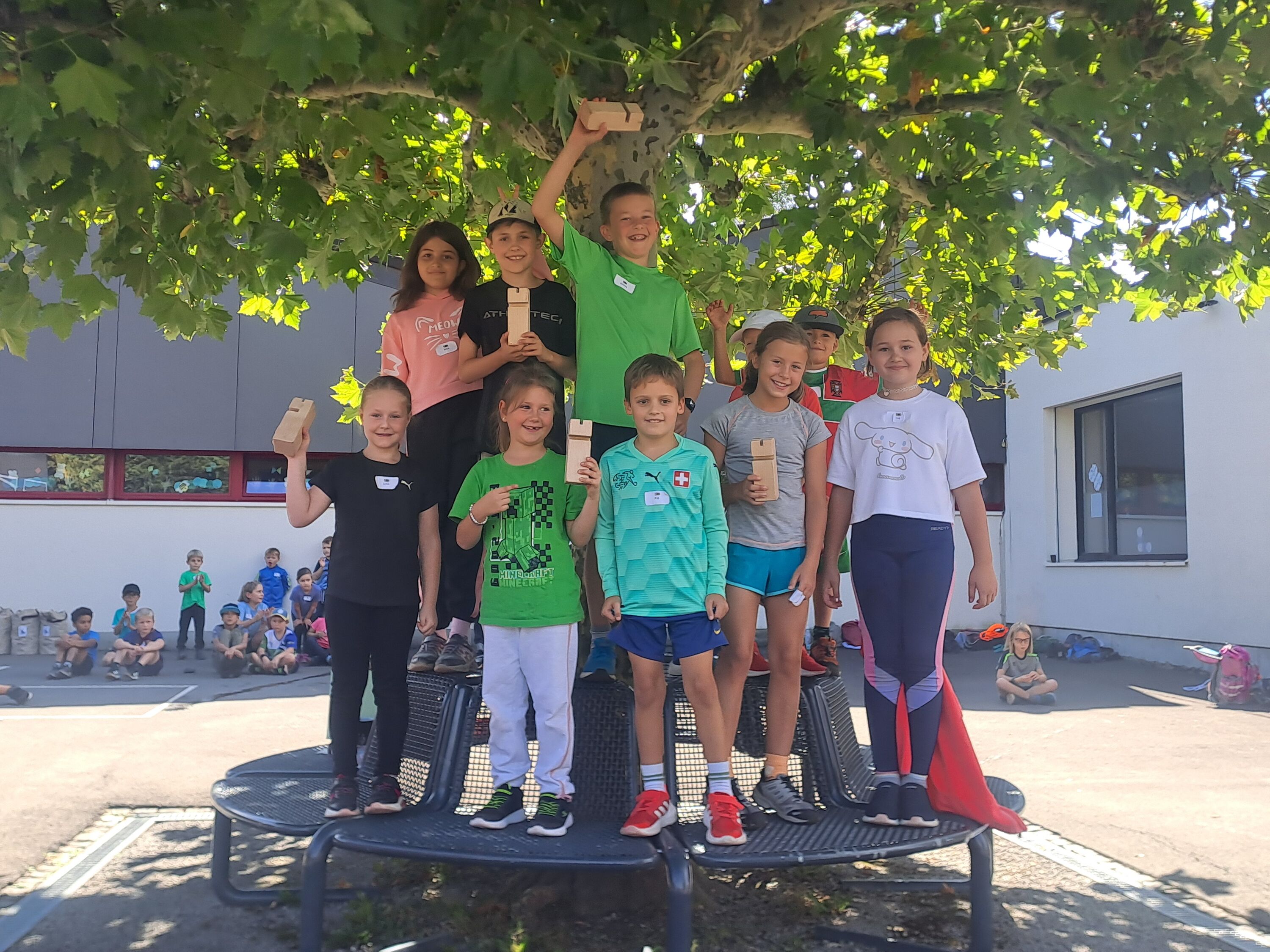 Im Roosen war einiges los! Die Schmetterlinge des Kindergartens und alle Schulkinder trafen sich auf dem Areal, um einen gemeinsamen Sportmorgen zu verbringen. Gestartet wurde mit einem bereits bekannten Tanz auf der Wiese. Anschliessend spielten die Kinder in Gruppen unterschiedliche Spiele, wobei sie sich auch aneinander messen konnten. Die Posten forderten Schnelligkeit, Zusammenarbeit und Mitarbeit jedes einzelnen Team-Mitliedes sowie viel Geschick. Die Kinder versuchten sich am Fröbelturm, an einem Hindernislauf oder warfen mit Gummistiefeln um die Wette. Ebenfalls machten sie eine Wasserstafette, bauten Kappla- und Giraffen-Türme. Besonders viel Geschick und das Quäntchen Glück benötigten sie bei der Bottle-Flip-Stafette.